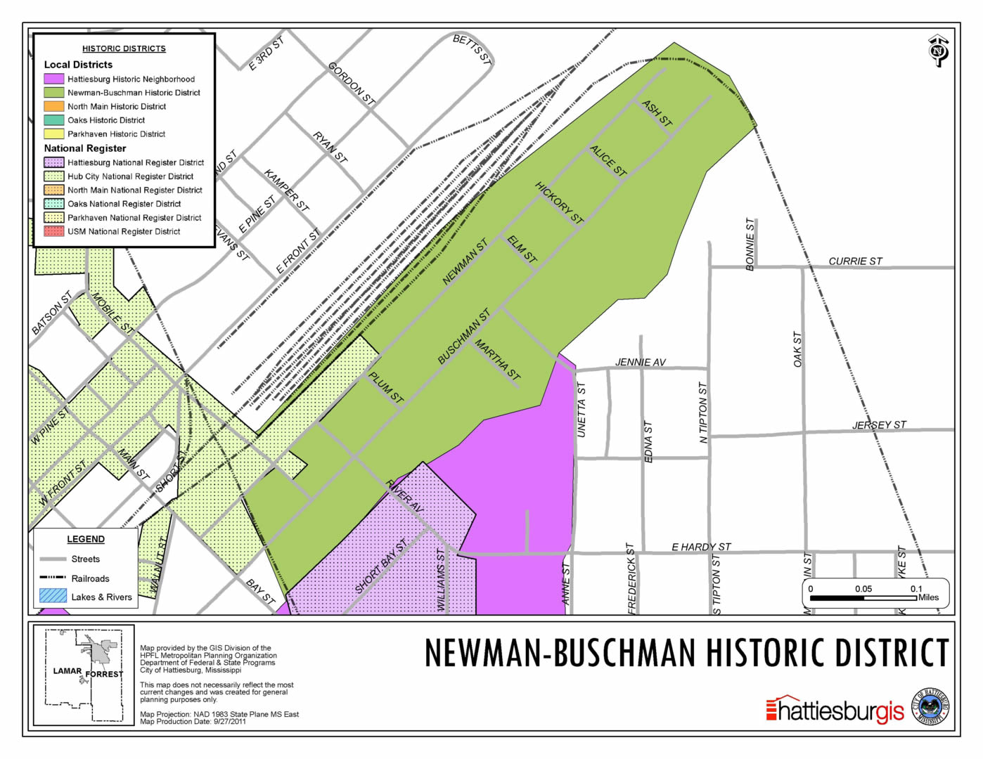 In 1980 the Hattiesburg Historic Neighborhood District was listed with the National Register of Historic Places. This was the first area in Hattiesburg to receive that recognition. Currently, there are five historic districts in Hattiesburg: Hattiesburg Historic Neighborhood District, North Main Street Historic District, Newman-Buschman Railroad Historic District, Parkhaven Historic District, and The Oaks Historic District.
